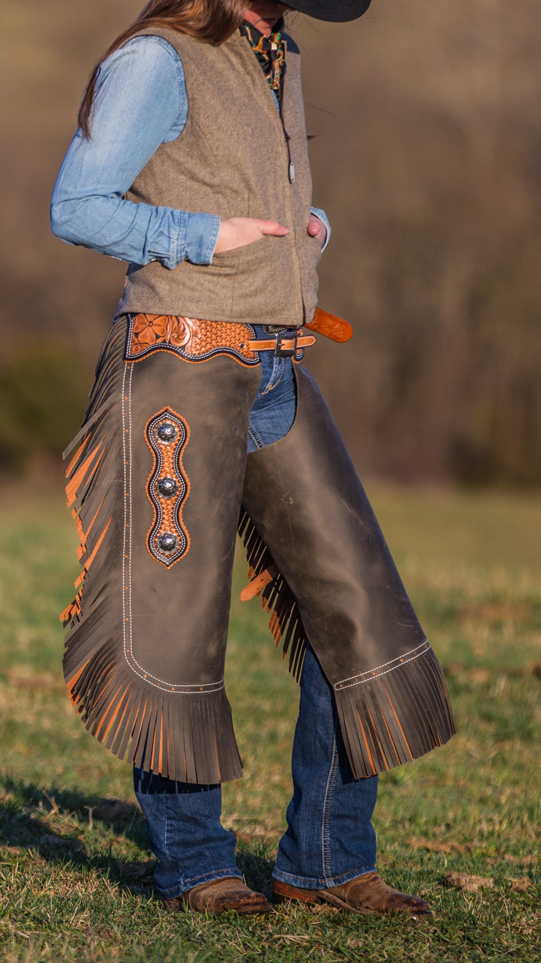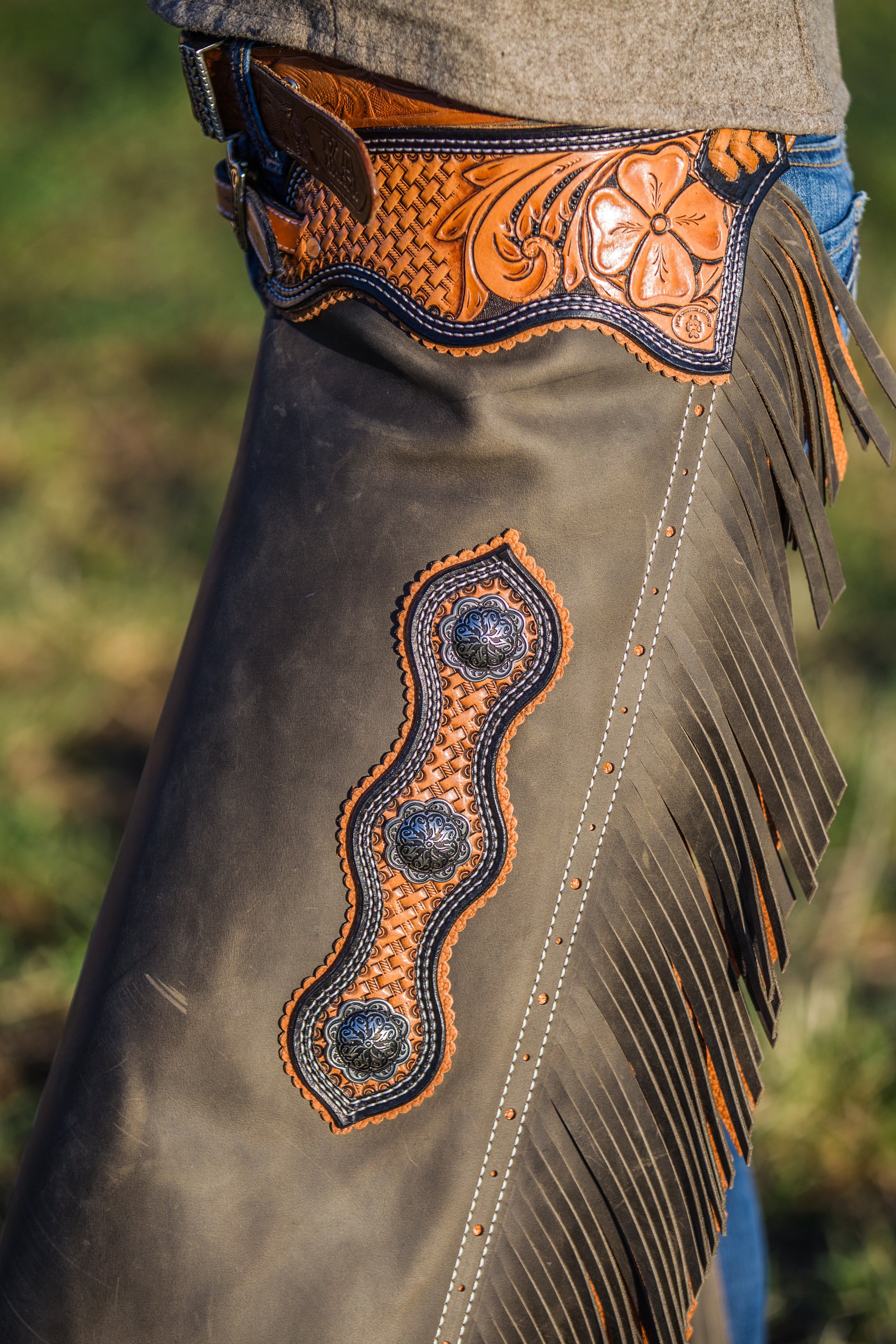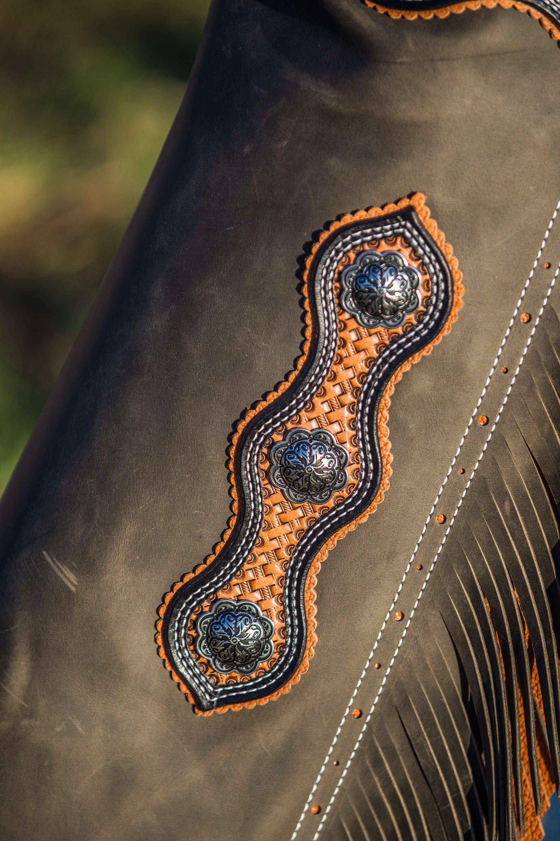 These custom hand-tooled western chinks are a work of art. They are gray and natural in color with black accents and natural scallops. We used high quality stainless steel Jeremiah Watt (horseshoe brand) hardware with black background. Yokes are made of the highest quality Hermann Oak veg-tanned leather. They are double stitched. The chap leather is durable and water repellent. They even have double fringe! This set is built to last.