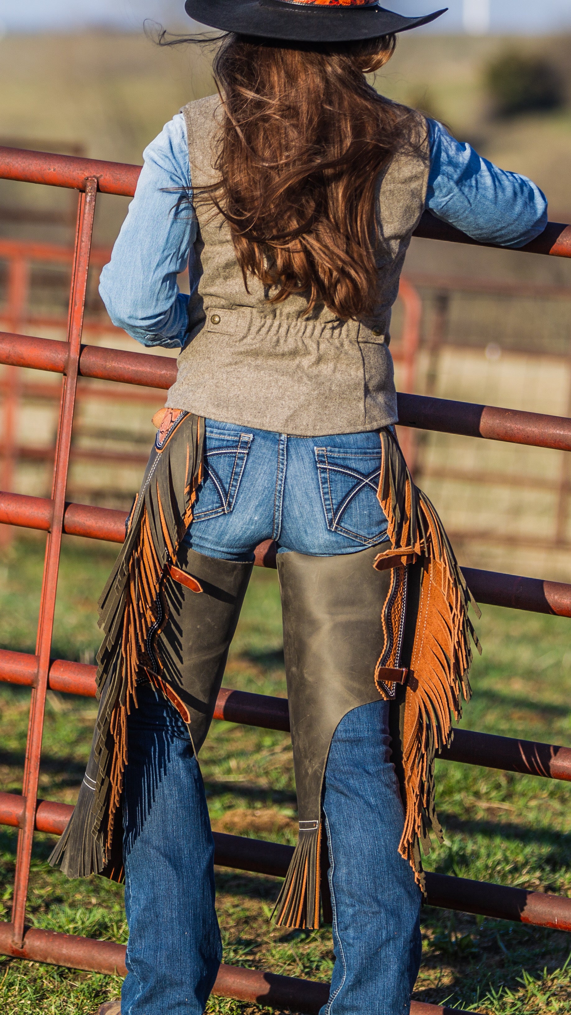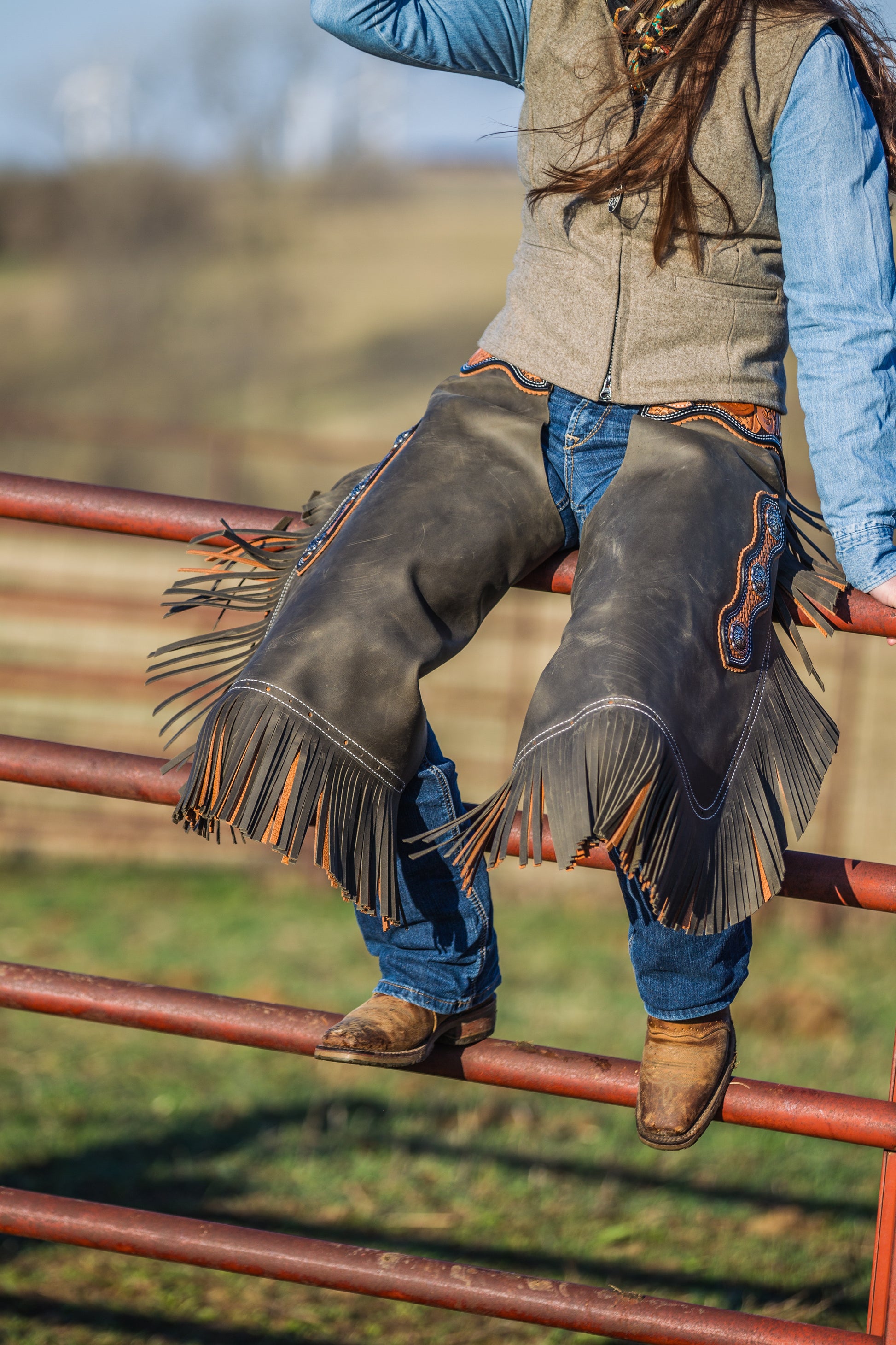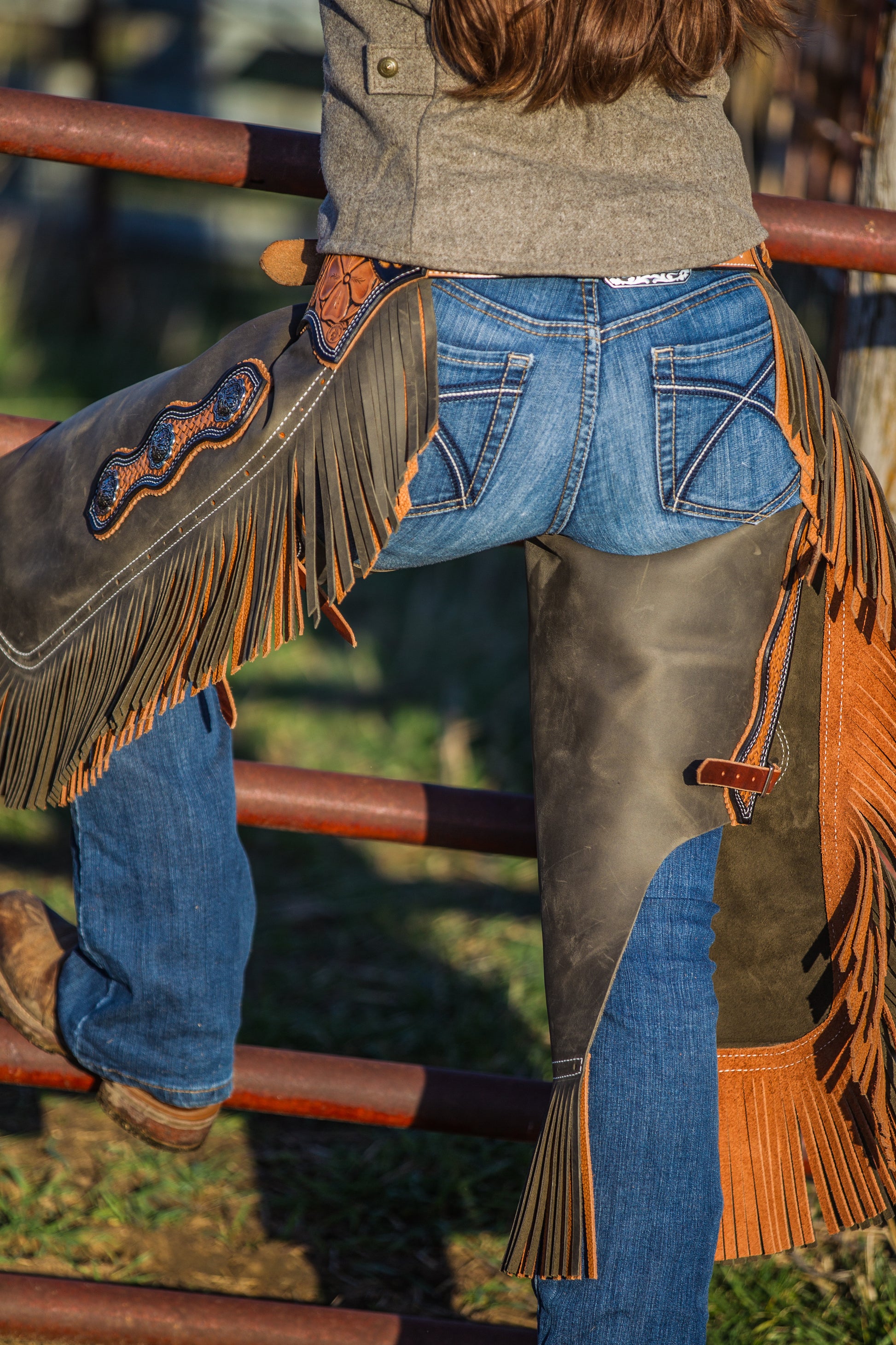 These custom hand-tooled western chinks are a work of art. They are gray and natural in color with black accents and natural scallops. We used high quality stainless steel Jeremiah Watt (horseshoe brand) hardware with black background. Yokes are made of the highest quality Hermann Oak veg-tanned leather. They are double stitched. The chap leather is durable and water repellent. They even have double fringe! This set is built to last.